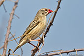 Lake Beseka, Ethiopia The Red-billed Quelea has been described as possibly the most abundant bird in the world. It is distributed throughout much of Africa outside the rainforest. See the distribution map at Birdlife International. It is found in bush, grasslands and in agricultural areas where it feeds on grass and cereal seeds. The breeding male has a black mask while the non-breeding male and the female have streaked plumage a bit like a sparrow, a red bill and a white superciliary. They are migratory and tend to follow rainfall. When they arrive they can appear in enormous flocks and are regarded by many farmers as a pest. |