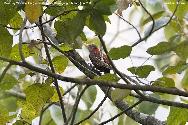 Shemgang, Bhutan The Bay Woodpecker is distributed from Nepal to south China and southwards towards south Vietnam and the Malaysian Peninsula. It is found in mature, broadleaved forest with dense undergrowth and often with bamboo. |