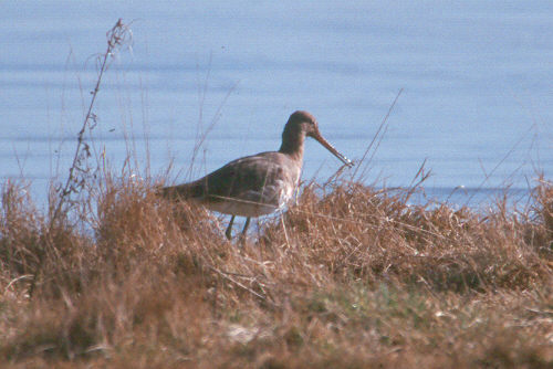 Black-tailed Godwits can be easily confused with Bar-tailed Godwits (Limosa lapponica) particularly in their winter plumage. It is helpful if you can see the top of the tail, unfortunately hidden in the first photo, because this is black while, not surprisingly, it is barred in the case of the Bar-tailed Godwit |