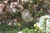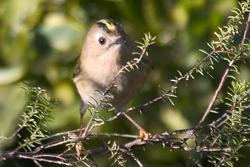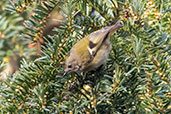 The Goldcrest is distributed throughout most of Europe and across southern Siberia and the Himalayas to Japan and China. See the distribution map at xeno-canto. It has a more northerly distribution than the similar Firecrest Regulus ignicapillus which is found, for example in southern England while Goldcrest is found throughout the British Isles. It is closely linked to coniferous forest and woodland preferring spruce, silver fir and mountain pine to larch and Scots pine. It also seems to find introduced conifers attractive and I occasionally see a few Goldcrest in a mixed tit flock on a cypress tree near my house. More recently a pair have spent the winter in my garden. |
