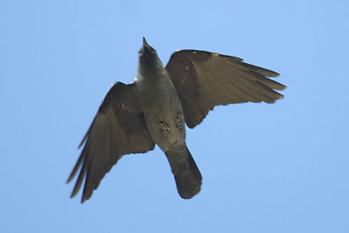 It is dark grey rather than black with a lighter grey on the nape and the sides of the head. The eye is white and the bill is more slender than most other members of the crow family |