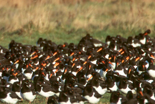 Oystercatchers form large flocks during the winter and this first photo at Musselburgh shows part of such a flock. Musselburgh normally has over 2,000 birds during the winter. While a large number of birds are resident breeders in Britain, their numbers are swollen during the winter with migrants from Iceland and Norway. |