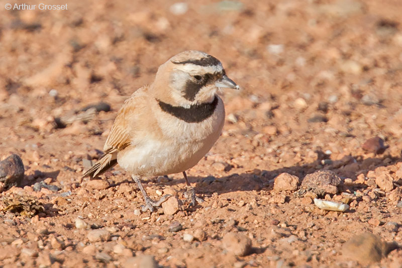 | Boumalne du Dades, Morocco April 2014 Temminck's Lark is distributed along the north of Africa from Western Sahara through Morocco to Egypt and into the Middle East. See the distribution map at Birdlife International. It is found in semi-desert but avoids soft sand. It is found at lower altitudes than Horned Lark E. alpestris. Compared to that species, the facial colouring is always black and white and the black collar comes to a narrow rather than a broad point. |