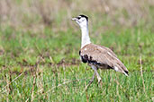 | Lakefield National Park, Queensland, Australia November 2010 The Australian Bustard was distributed throughout most of Australia as well as southern Papua New Guinea. With European settlement, it has disappeared from the more populated areas of the south-east, south-west and southern Australia. It is found in a variety of grasslands and scrub. It feeds on seeds of grasses and other native plants as well as grasshoppers, crickets, other insects, small mammals such as mice and reptiles. It is a large bird with a dark crown and nape and usually has its head pointing rather aloofly in the air. The male has a black breast band which is missing in the female. |