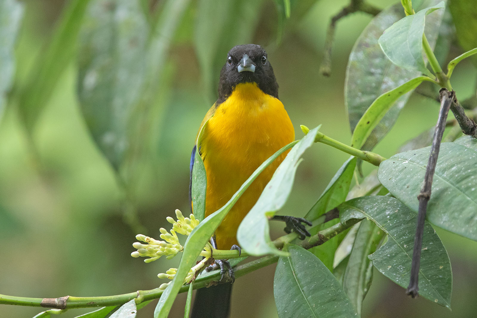 | Amagusa Reserve, Pichincha, Ecuador November 2019 The Black-chinned Mountain-tanager is distributed on the western slope of the Andes from central Colombia to northern Ecuador. See the distribution map at Birdlife International. It is found in the canopy and borders of wet, mossy forest at between 900 and 2,200 metres. |