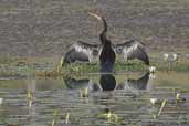 | Their long, slender necks are more like a heron than a cormorant with an angle midway that allows them to spear fish with a rapid thrust. They are normally found in pairs or small family groups and can be quite territorial. However, they are often found with Cormorants and Herons with whom there appears to be little competition given the different fishing techniques used. The Anhinga will fish alone and not very actively, waiting, submerged, for the prey to come within reach of its darting bill. | ||||