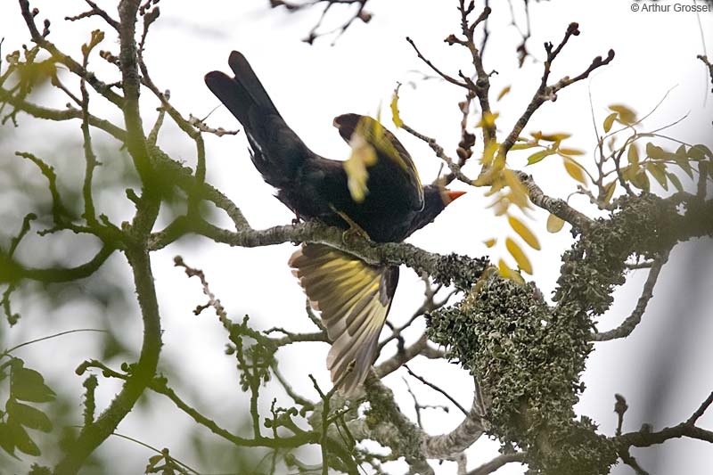 distribution map at xeno-canto. The male, seen here is all black except for the large yellow-golden patch on its wings and a bright orange bill. The iris is reddish-brown. |