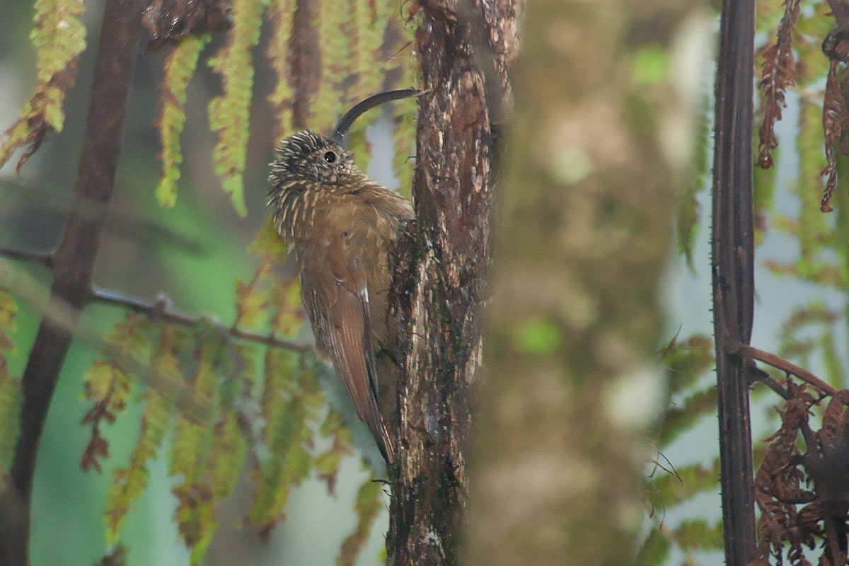 | São Paulo state, Brazil The Black-billed Scythebill is distributed in south-east Brazil and into adjacent areas of Paraguay and Argentina. It is found in Atlantic Rain Forest and secondary woodland, often associated with stands of bamboo. It has a very long, decurved black bill the colour of which distinguishes it from the other two scythebills found in Brazil; Red-billed Scythebill Campylorhamphus trochilirostris and Curve-billed Scythebill C. procurvoides. Otherwise it is olive-brown above with a black head and nape with white streaks. The wings and tail are chestnut-rufous and the throat is whitish. |