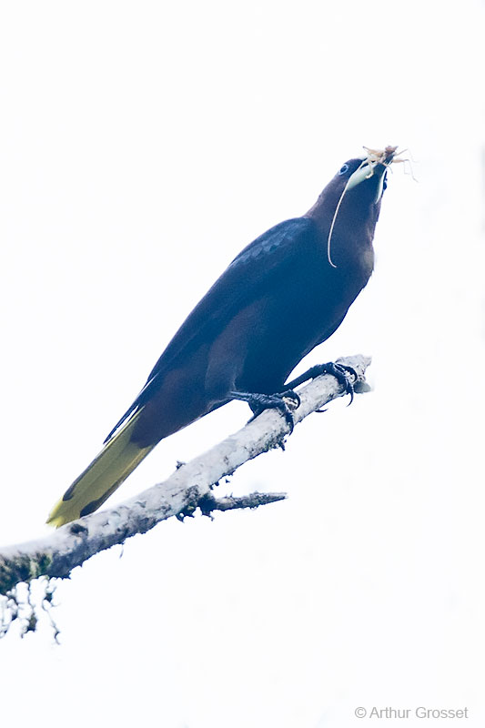 Like all Oropendolas it is social, gregarious and arboreal feeding mainly in the canopy and on insects. |