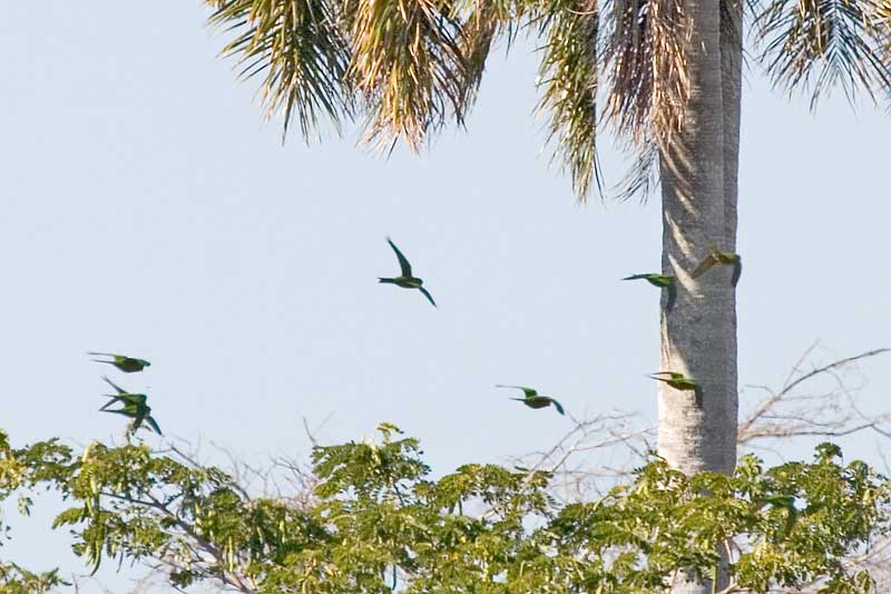 | It is found in grasslands with palms, notably the Royal Palm, at woodland edges and in undisturbed forest but requires nesting holes in palms or in arboreal termite nests many of which are abandoned woodpecker holes. It is bright green with red spots scattered on the head, neck and breast and red at the bend of the wing. It has a white ring of bare flesh round the eye. They fly in small flocks and this particular flock in Najasa consisted of about 12 individuals. There is an excellent page on this species at Birdlife International. |