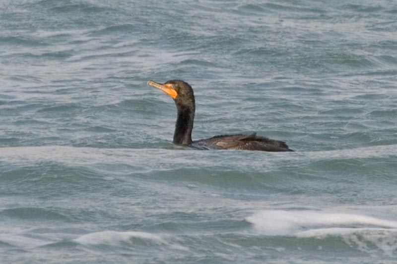 | It is black with a greenish sheen. The bare skin on the face and throat is orange. It is difficult to see the crest far less the fact that it is double but, in flight, it has a characteristic kink in the neck. It feeds almost exclusively on fish. |