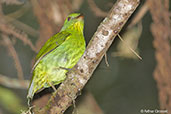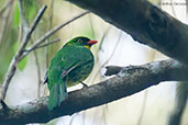 | It has a coral red bill, grey legs and a yellow iris. The male has the throat and mid-chest bright golden-yellow. The sub-species found at Santa Marta, P. a. decora has a yellow line on the side of the neck. The female, seen here in photo 4, has green underparts with yellowish streaking. The song is a high-pitched whistle. |