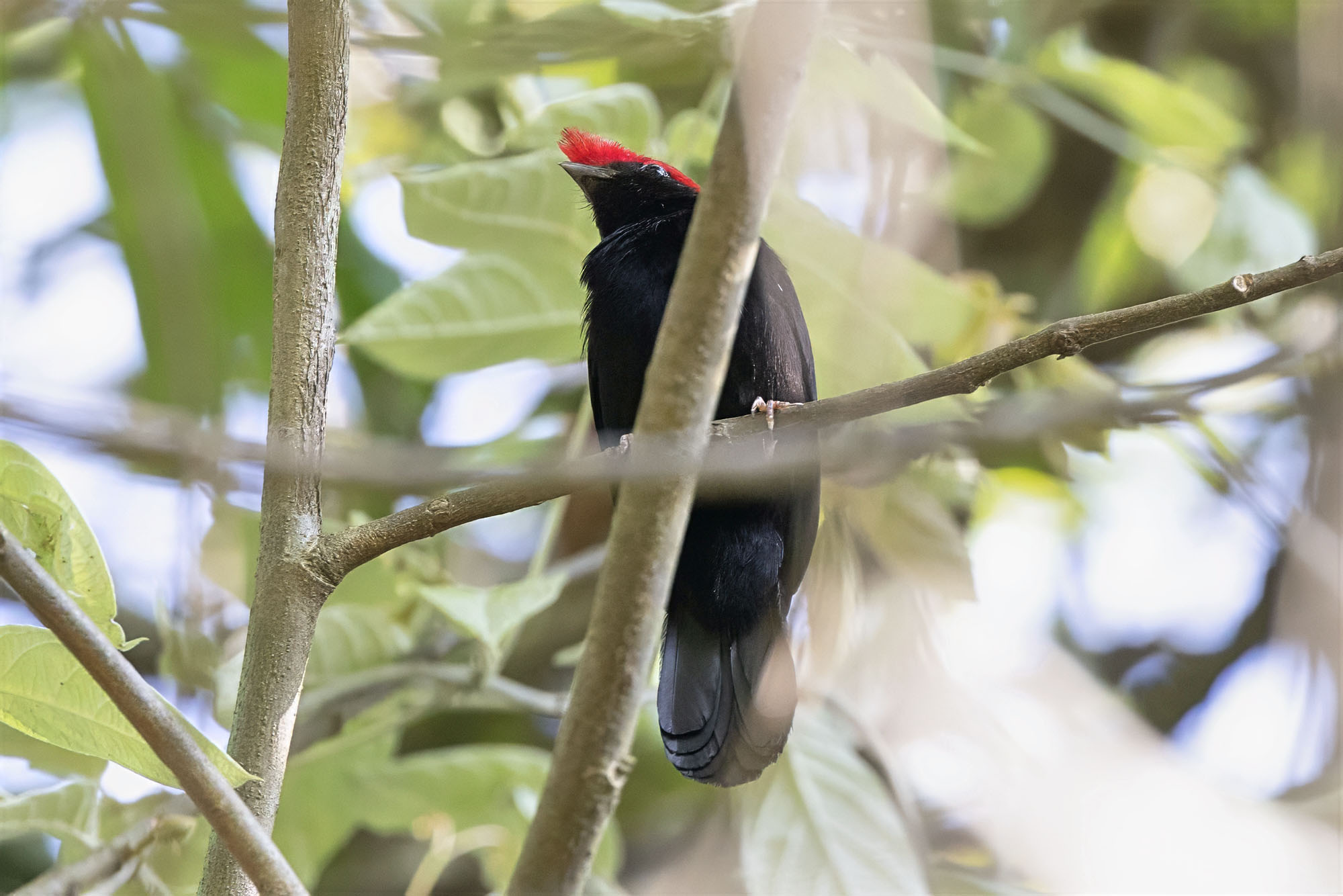 Brazil The Helmeted Manakin is distributed in central Brazil and adjacent areas of north-east Bolivia and north-east Paraguay. See the distribution map at xeno-canto. It is mainly found in gallery woodland in the cerrado grasslands. The female shows the frontal crest and the long tail. Photos 1 and 2 were the first register of this species in the area of the Chapada Diamantina of Bahia. The male in photo 3 is striking with its black body and bright red "helmet" |