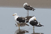 It has a mainly white body with a contrasting black mantle, yellow bill with a red spot near the tip of its lower