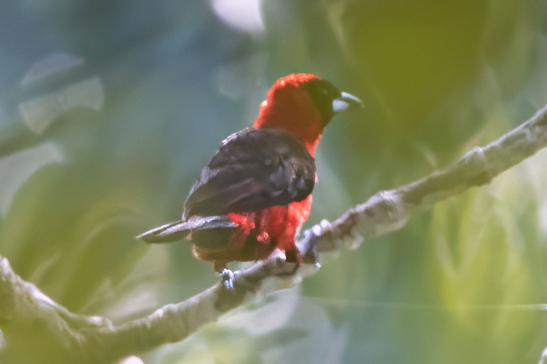 | Sani Lodge, Sucumbios, Ecuador November 2019 The Masked Crimson Tanager is distributed in the west of the Amazon Basin up to the eastern foothills of the Andes in Colombia, Ecuador and Peru. See the distribution map at xeno-canto. It is found in forest borders and usually near water |
