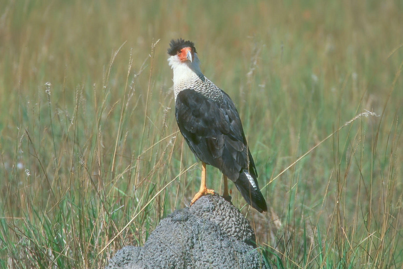 | Roraima, Brazil July 2001 The Crested Caracara is very similar to the Southern Caracara (Caracara plancus) the main visual difference being that the Northern Caracara has more black on the lower back. Evidence that the Crested Caracara is a separate species was presented by Dove & Banks in 1999 in the Wilson Bulletin 111(3): 330-339. |