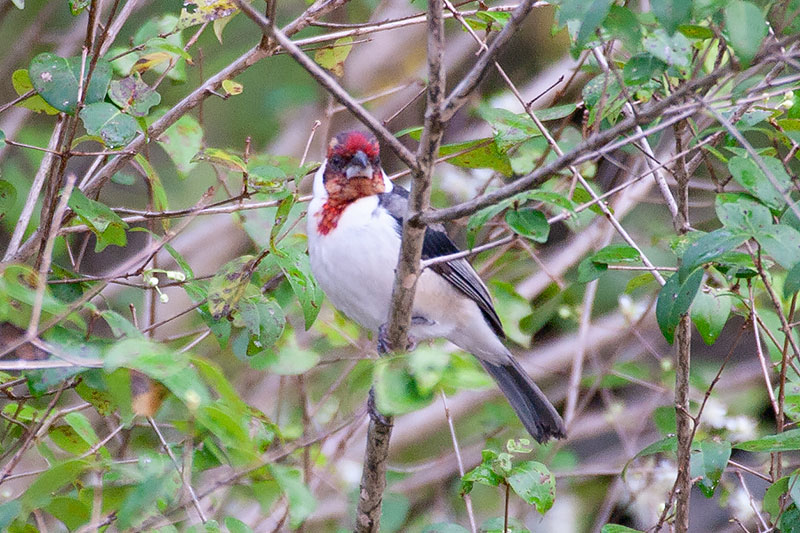 The Red-cowled Cardinal is a Brazilian endemic found in semi-open scrub and caatinga woodland in north east Brazil. Apart from its conspicuous red head and white underparts, note the mottled black and white on the back and the conspicuous white edging to the flight feathers. The lower mandible is white. |