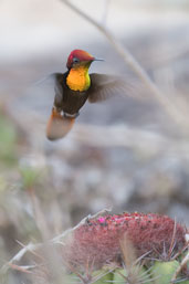 the nectar of small cactus flowers. The male, shown here, is one of the most striking hummingbirds with its ruby red crown and nape and its shiny gold throat and breast. When the light does not catch the iridescence, as in photos 2 and 5, it can look surprisingly dull. |