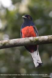 | Brazil The Surucua Trogon is distributed in east-central and south-east Brazil and into adjacent areas of Paraguay and Argentina. See the distribution map at xeno-canto. It is found in the mid-storey of forest and woodland where it feeds mainly on insects but also some small fruits. While the HBW and Birdlife International Checklist treat this as a separate species many authorities lump it with Northern Surucua Trogon S. aurantius. In such treatment there are two distinct sub-species. Photos 1 and 2 show the nominate sub-species T. s. surrucura where the male in photo 1 has an orange ring around the eye, black to dark blue head, neck and breast, pinkish-red belly and all white undertail. The female in photo 2 has a pinkish-red lower belly but is otherwise grey with a black tail with white edging. |