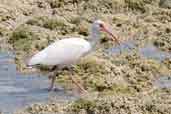 | It is white with a red bill, face and legs. The tips of the wings are black and they are just visible in the firts photo. The second photo shows an immature. They feed mainly on shellfish, frogs, snails and insects. |