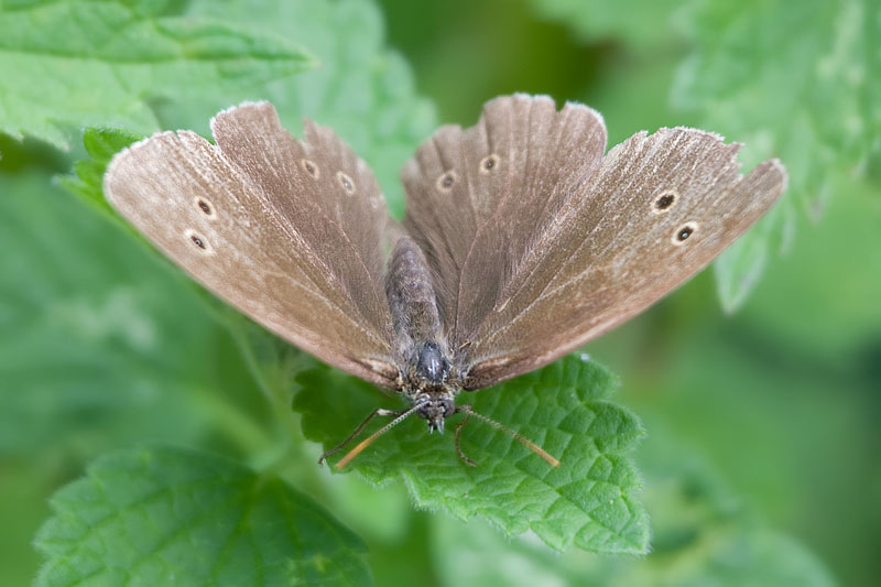 England July 2008 The Ringlet is found mainly in damp woodland glades, along hedges and river banks and, as in this occsion, in gardens. They are usually seen between mid-June and mid-August and are dark brown in general though the colour fades after a while. The underside show clearly the ringlets that give it its name. |